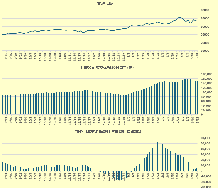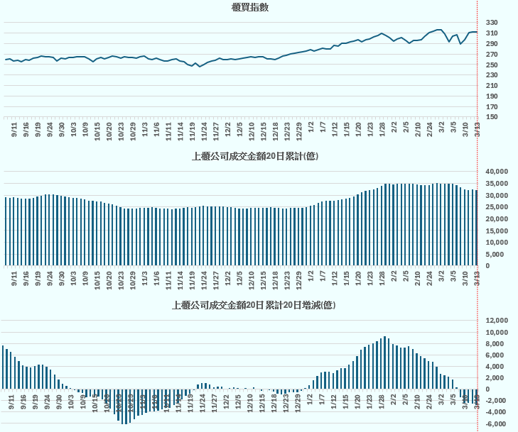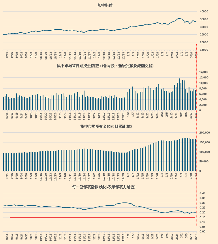 集中市場成交金額跟加權指數的對應。(留意每一億承載指數,越小表示承載力越低),概念來源 : 總大。