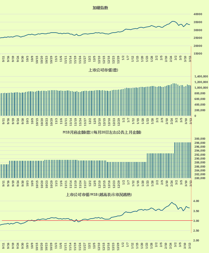 「上市公司市值 / M1B金額」 與加權指數的對應。(留意上市公司市值/M1B ,越高表示市況越熱),概念來源 : 總大。