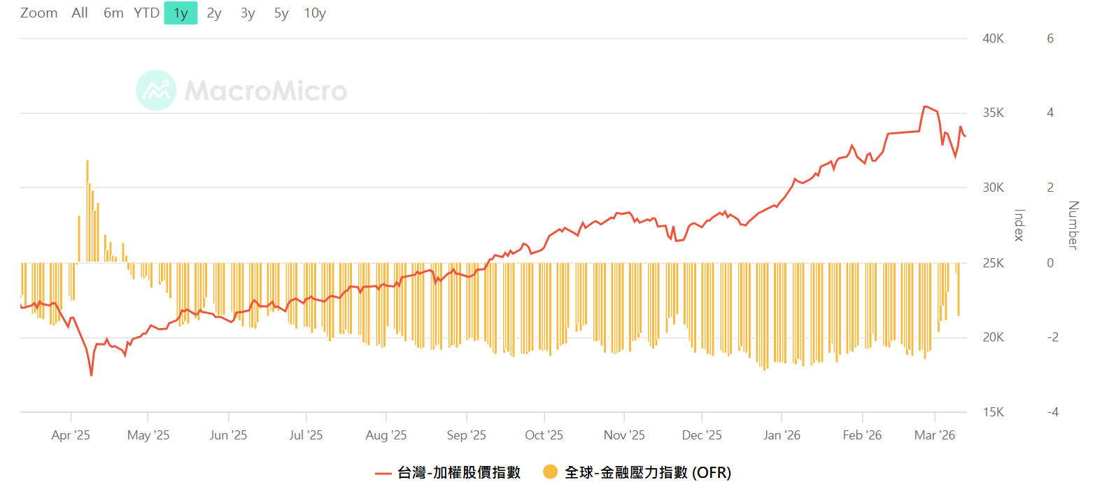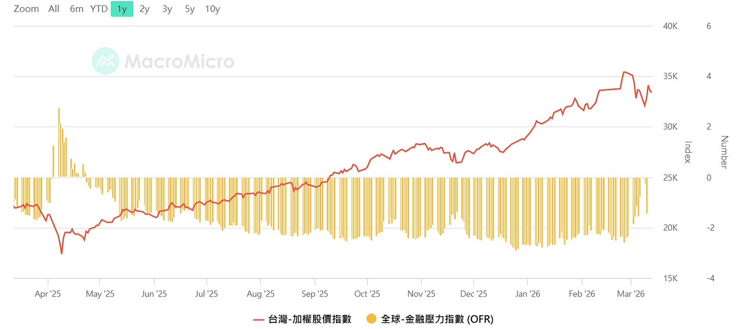 全球金融壓力指數vs加權,資料來源:MacroMicro 財經M平方,留意壓力指數從低點開始往上攀升