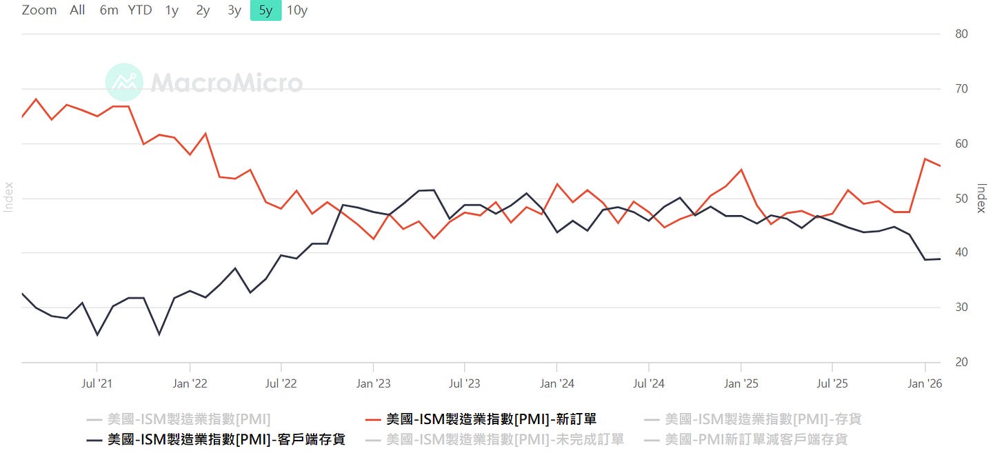 美國PMI新訂單,資料來源:MacroMicro 財經M平方,看「新訂單指數減客戶端庫存 (New Order - Customer’s inventory)」,透過這個相減指數,去抓客戶回補庫存的時機點,這才能跟上股市的 EPS 上修預期(參考美股韭菜王)。