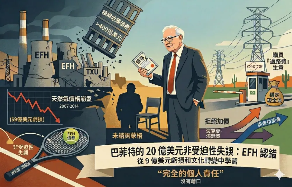 巴菲特在2007年買了一家德州電力公司債券,結果虧了將近9億美元,他自己在股東信裡說,這叫「非受迫性失誤」。