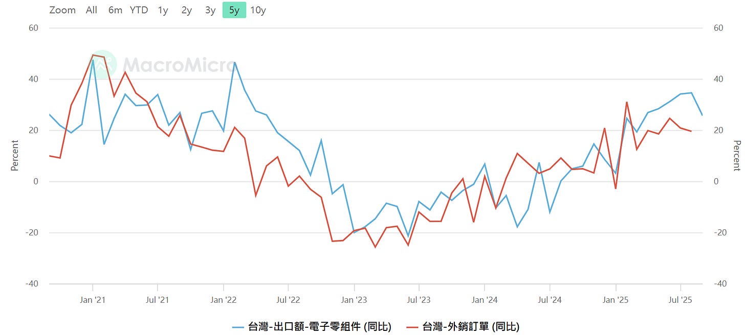 台灣-電子零組件出口(年增率) ,台灣-外銷訂單(年增率)注意高低點極值(-10~+20),資料來源:MacroMicro 財經M平方,SimonShih,財經雷說明
