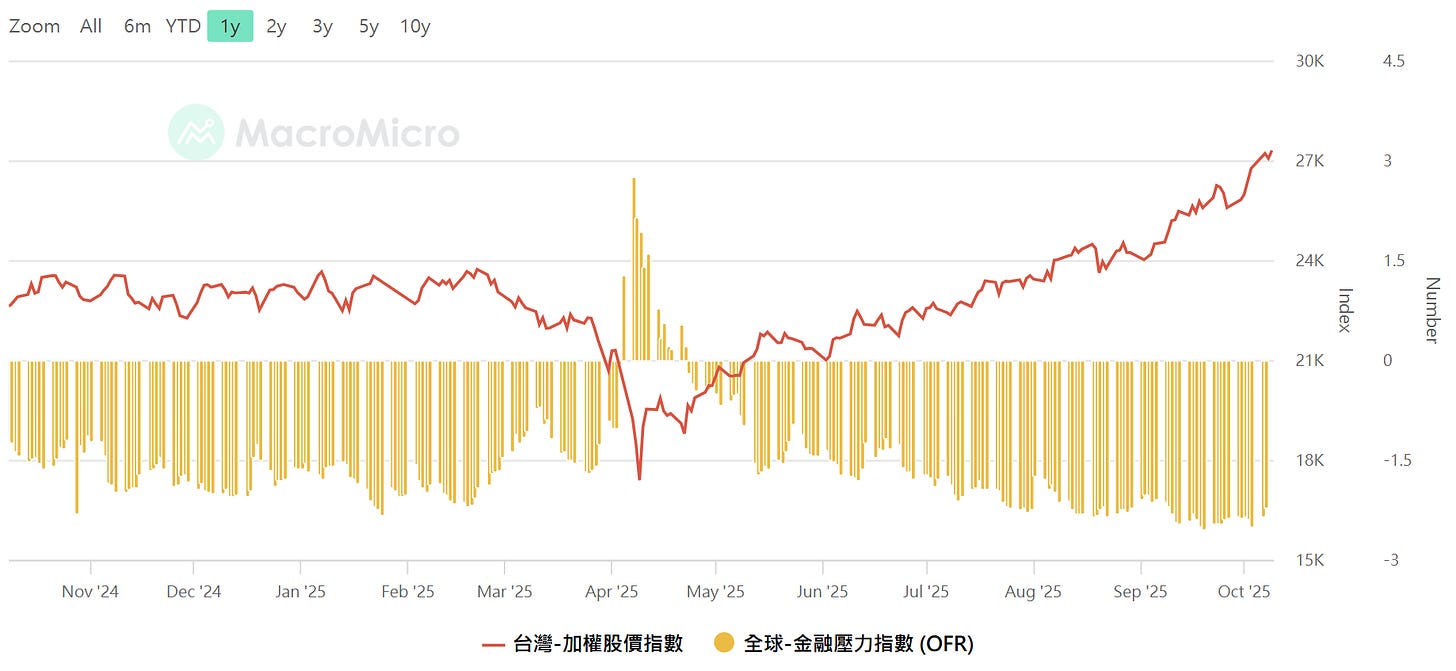 全球金融壓力指數vs加權,資料來源:MacroMicro 財經M平方,留意壓力指數從低點開始往上攀升