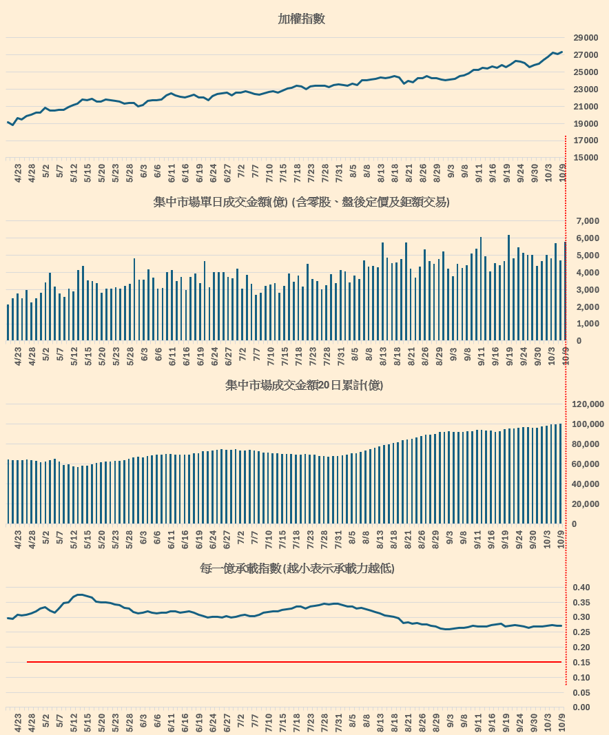集中市場成交金額跟加權指數的對應。(留意每一億承載指數,越小表示承載力越低),概念來源 : 總大。