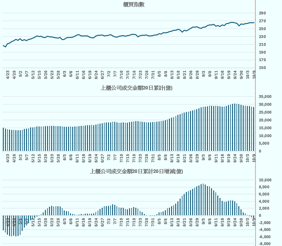 櫃買指數 vs 上櫃公司成交金額20日累計 vs 上櫃公司成交金額20日累計20日增減