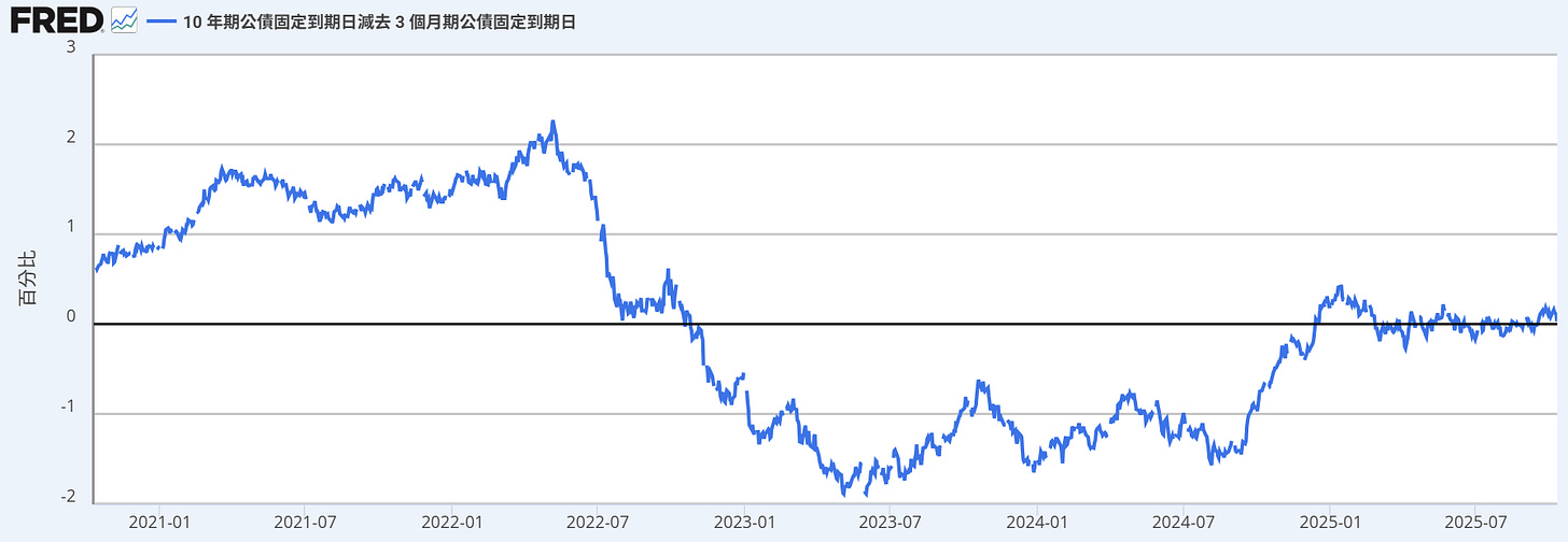 美10年債殖利率-3個月殖利率,資料來源:Fred