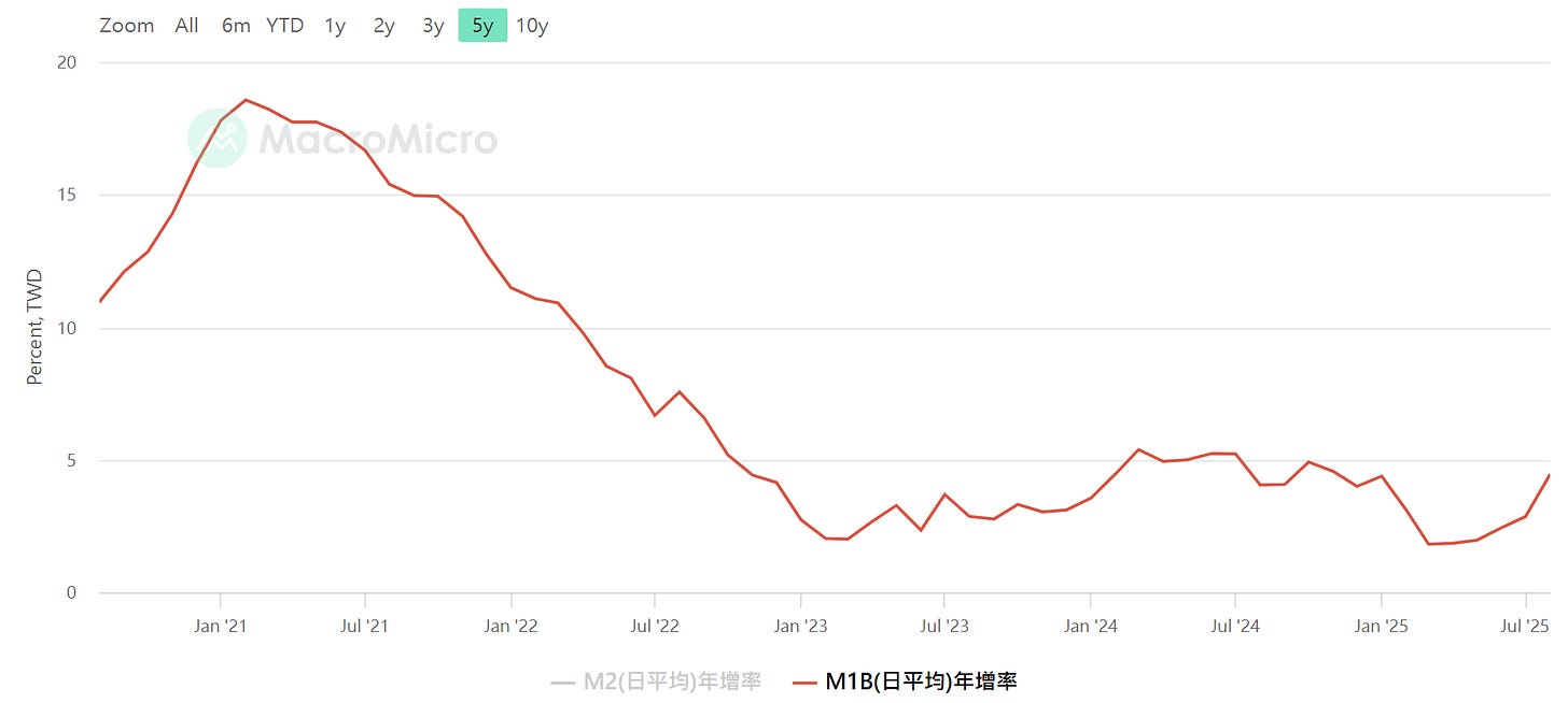 M1B年增率,若負值為警訊,資料來源:MacroMicro 財經M平方