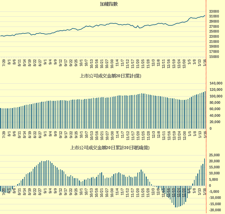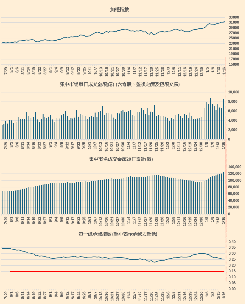 集中市場成交金額跟加權指數的對應。(留意每一億承載指數,越小表示承載力越低),概念來源 : 總大。