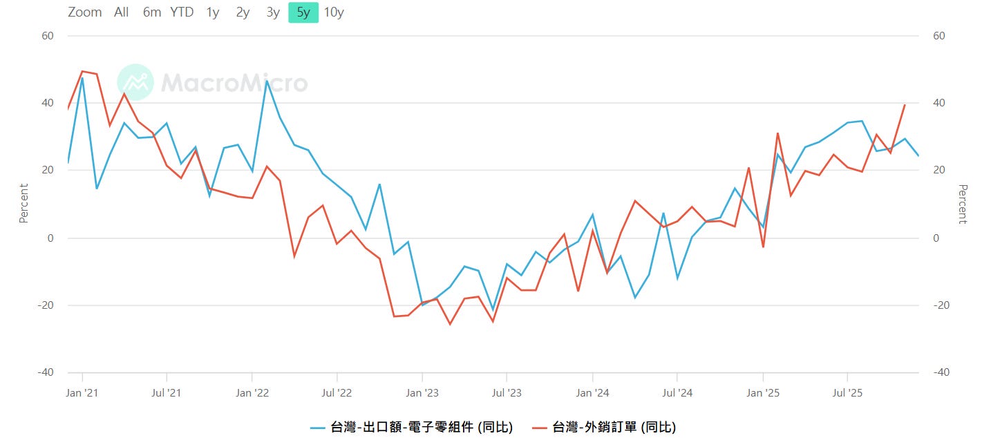 台灣-電子零組件出口(年增率) ,台灣-外銷訂單(年增率)注意高低點極值(-10~+20),資料來源:MacroMicro 財經M平方,SimonShih,財經雷說明