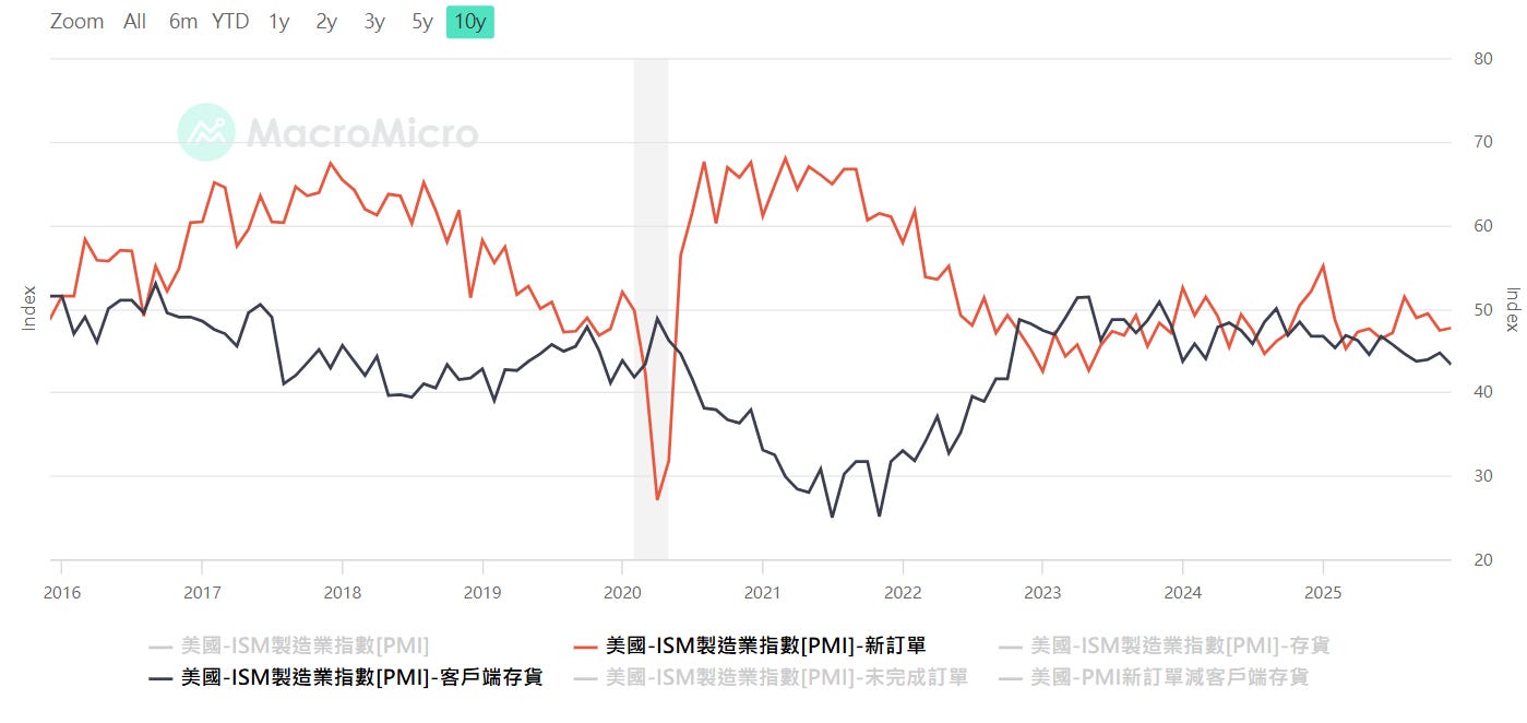 美國PMI新訂單,資料來源:MacroMicro 財經M平方,看「新訂單指數減客戶端庫存 (New Order - Customer’s inventory)」,透過這個相減指數,去抓客戶回補庫存的時機點,這才能跟上股市的 EPS 上修預期(參考美股韭菜王)。