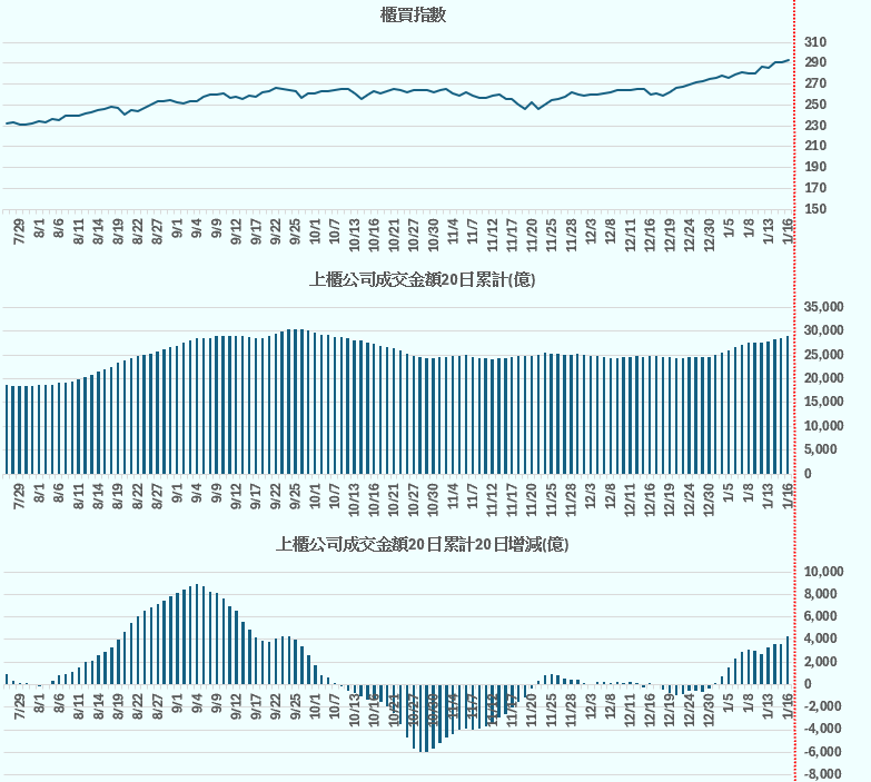加權指數 vs 上櫃公司投信買賣超金額20日累計(億)