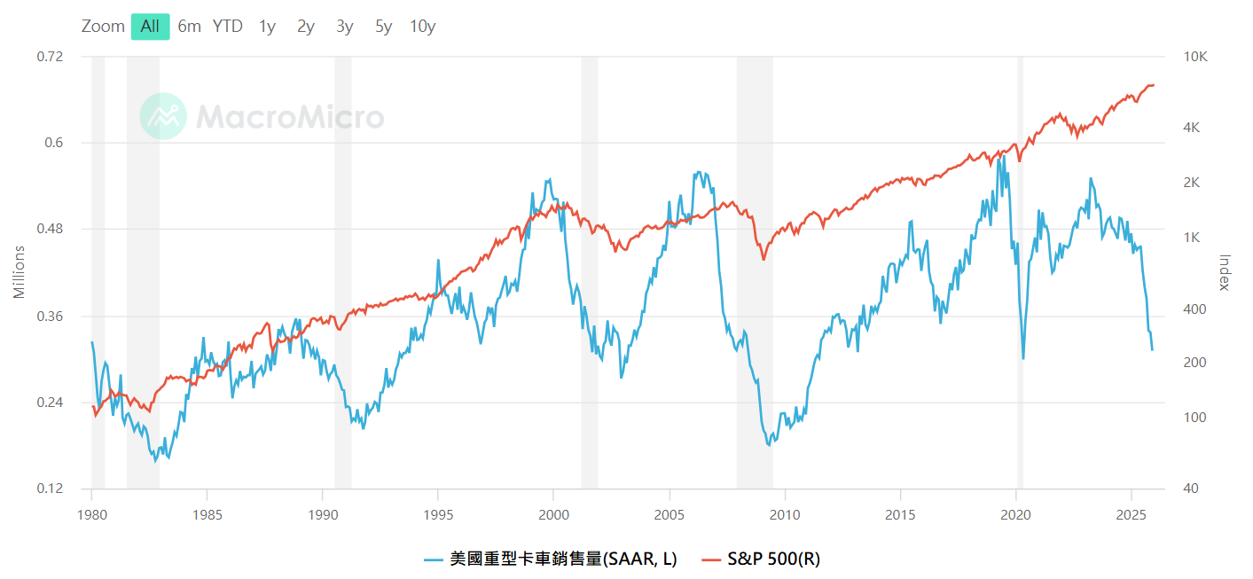 柯博文指數 (美國超過 6.35 公噸的卡車銷售量),資料來源 : MacroMicro財經M平方,智股網FB貼文連結