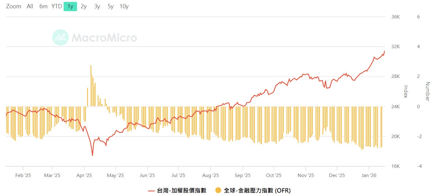全球金融壓力指數vs加權,資料來源:MacroMicro 財經M平方,留意壓力指數從低點開始往上攀升