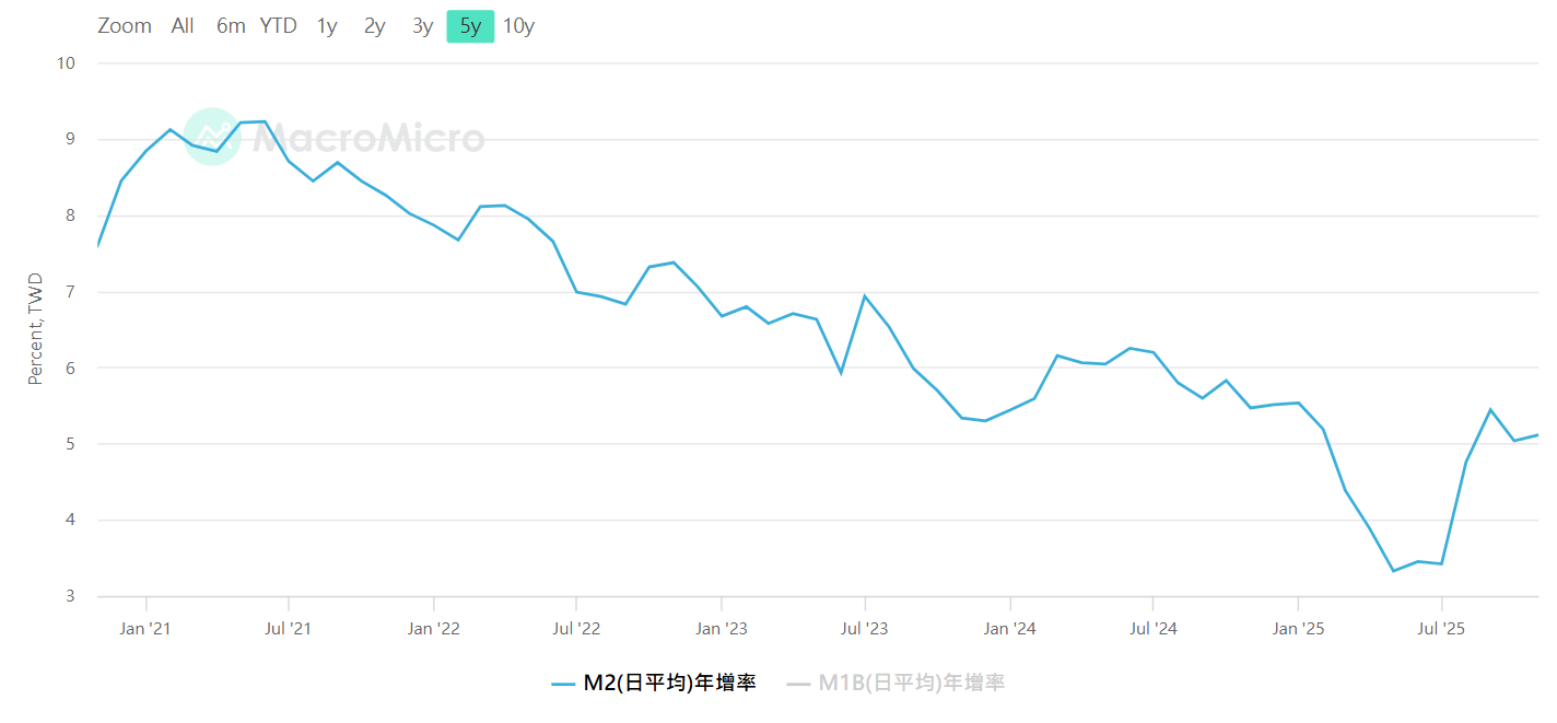 M1B年增率,若負值為警訊,資料來源:MacroMicro 財經M平方