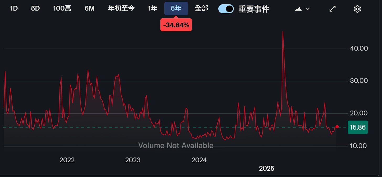 VIX :期權市場對未來 30 天標普 500 波動率預期,VIX長期平均約在19左右。若低於15,代表市場平靜;超過25,開始進入不安;若衝破30或40,多半是危機時刻,但它只能告訴你市場「表面的恐懼」,資料來源 : yahoo finance