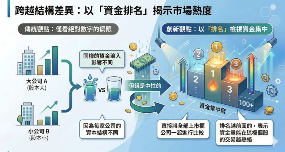 同樣都是用錢買,但因為股本的差異,這兩種資金量能排名看的重點就完全不同,大股本公司看的是絕對金額的延續性,而小股本公司看的是它相對體量的活躍度。