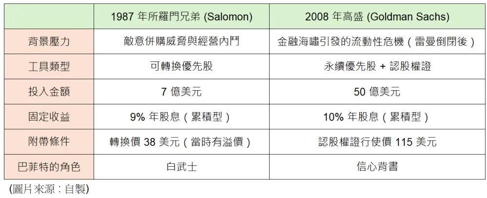 巴菲特在1987年利用了所羅門對敵意併購的恐懼,而在2008年則利用了全人類對金融系統崩潰的絕望,這種交易結構的本質,是將風險下限給控制住,同時又取得極大的向上獲利空間。