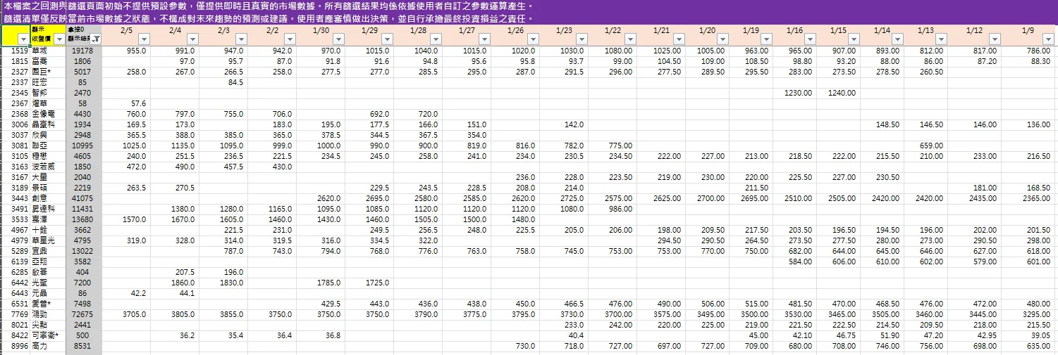這套工具最後的產出,是一份基於「你的參數設定」所產生的數據觀察清單,它將原本需要耗費數小時的資料對比,縮短至10~15分鐘,你只需要輸入自己回測過的參數,檔案就會自動掃描近期數據,列出符合「你所設定的邏輯」之標的。